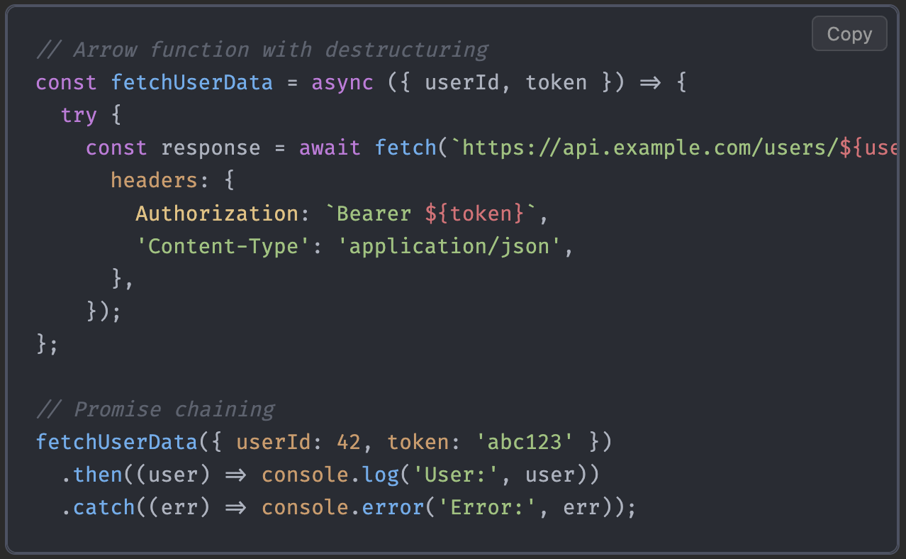highlight.js 기반의 Atom One Dark 테마로 코드 블록이 렌더링돼요. TypeScript, Python, Go, Rust, Dockerfile, SQL 등 대부분의 언어를 지원합니다.