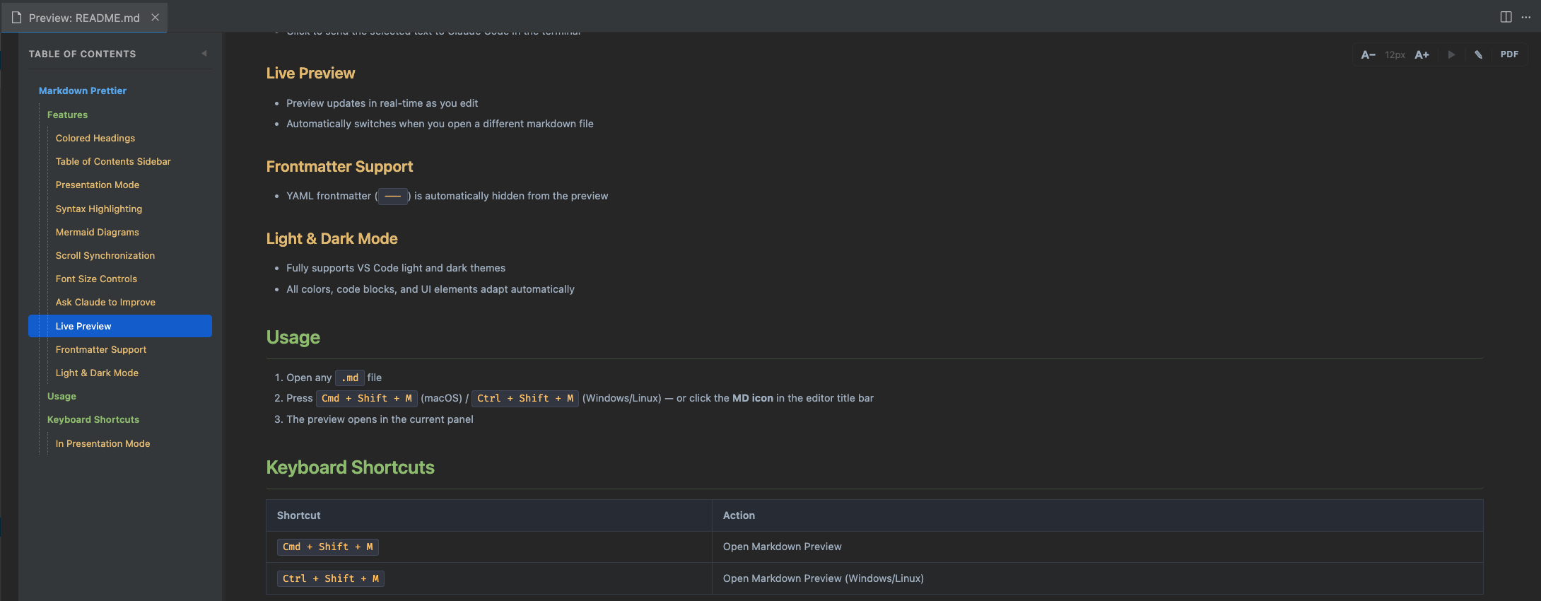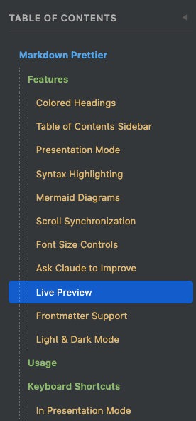 Markdown Preview Enhanced(MPE)가 전통적으로 가장 많은 기능을 가지고 있지만, 헤딩 색상 구분, TOC 사이드바(검색/리사이즈), 폰트 크기 조절, 슬래시 커맨드, AI 글쓰기 개선은 Markdown Prettier만의 기능이에요.